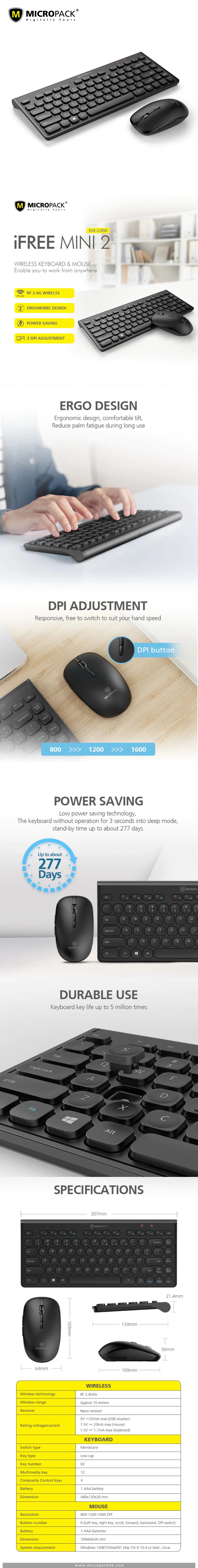 | Keyboard | Switch Type: Membrane Key Type: Low cap Key Number: 82 Multimedia Key: 12 Composite Control Keys: 4 Battery: 1 AAA battery Dimension: 307x139x21.4 mm |