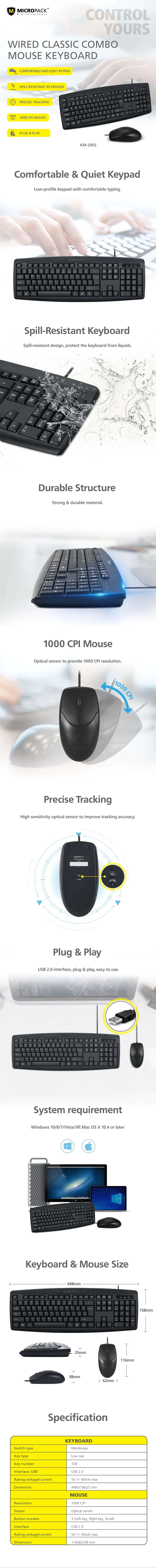 | Keyboard | Switch Type: Membrane Key Type: Low cap Key Number: 104 Interface: USB 2.0 Dimension: 448x158x25 mm |